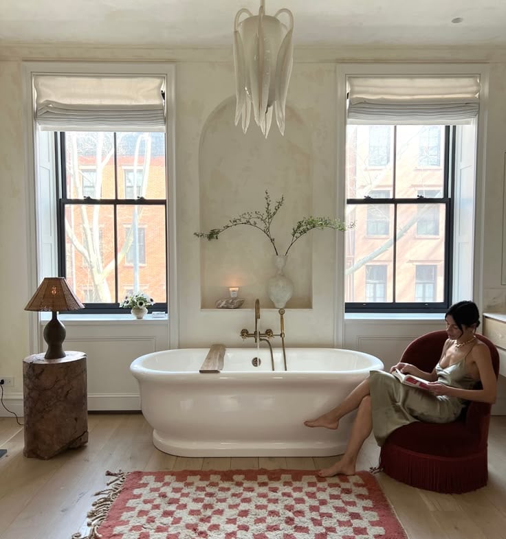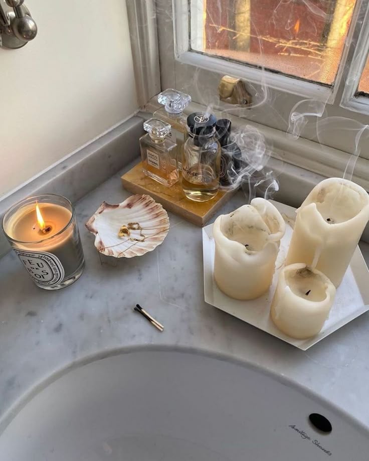 Bathrooms tend to err more on the clinical or sterile side, so you can inject some warmth into the space via ambient lighting. Forget your harsh overheard ceiling light, and instead opt for the soft glow of a lamp. Extra points if it's portable, and can be transported to different areas of the room depending on your mood. Engage the senses with scent, lighting a candle before your bath or shower or dispensing a few drops of essential oil into a diffuser.