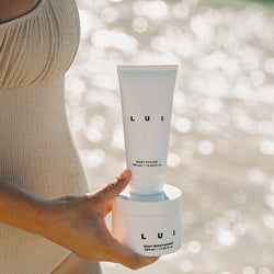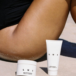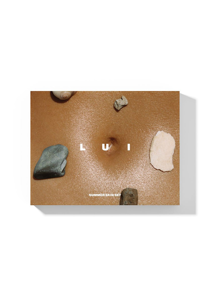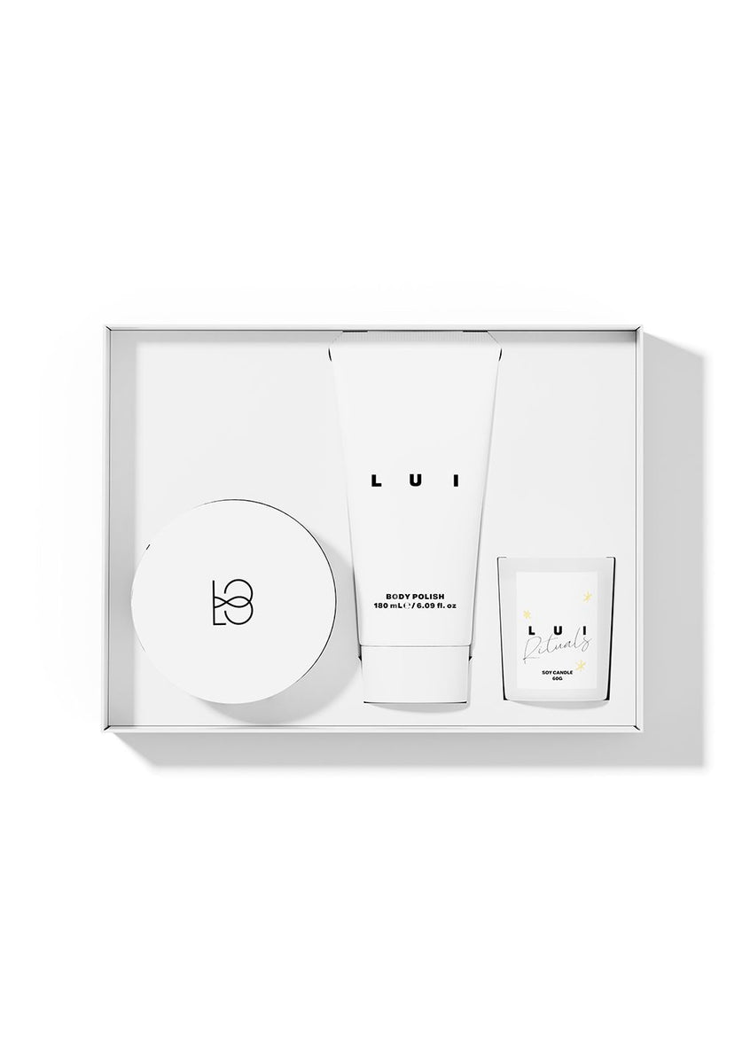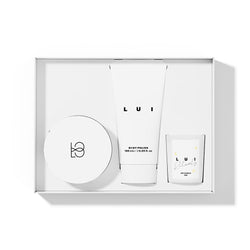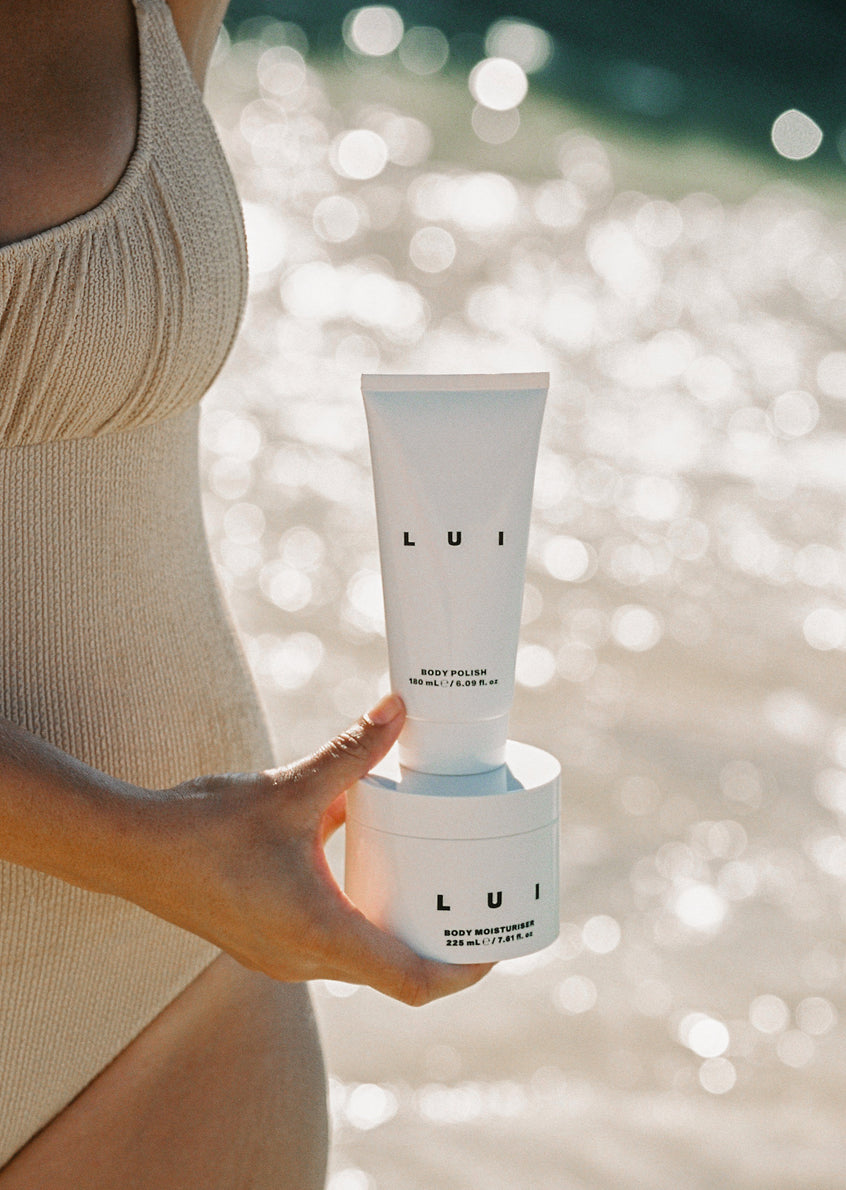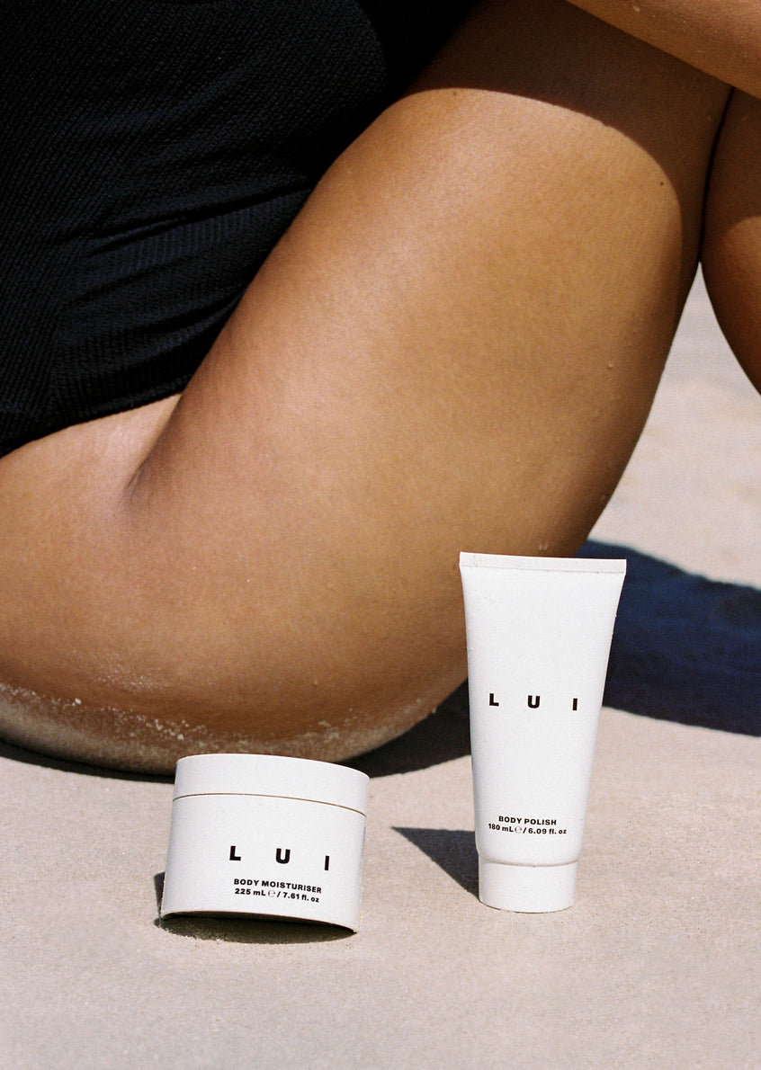 The Summer Skin Set includes a full-sized Body Polish, Body Moisturiser and a bespoke LUI Candle fragranced with our signature scent of orange blossom, iris and vetiver.